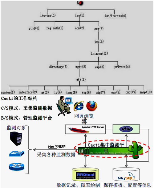 SNMP(收集数据) –>RRD Tool(绘图) –>Apache(平台展示)