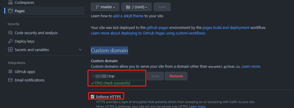 - Github Pages的settings下Custom domain配置域名,开启htpps